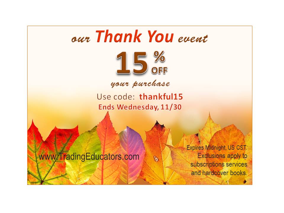 For those of you who celebrated Thanksgiving Day, we hope it was a terrific day for you. For those of you who live in countries where there is no Thanksgiving Day, perhaps you should give it a try. Set aside a day to be thankful for what you have. Everyone has something to be thankful for. At Trading Educators we are thankful that we have so much to share with all of you.